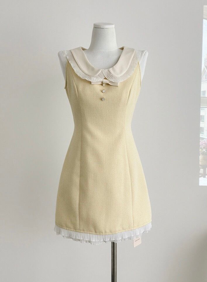 フリルのついた大きめのカラーが特徴的なミニワンピース。可愛らしいリボンとボタンのディテールがフェミニンな印象を与え、デイリー使いにぴったりの一着です。