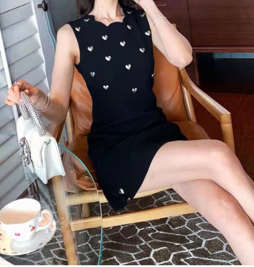 ハート型のパールアクセントが散りばめられたミニドレス。シンプルながらも個性的なデザインで、特別な日のおしゃれにぴったりです。