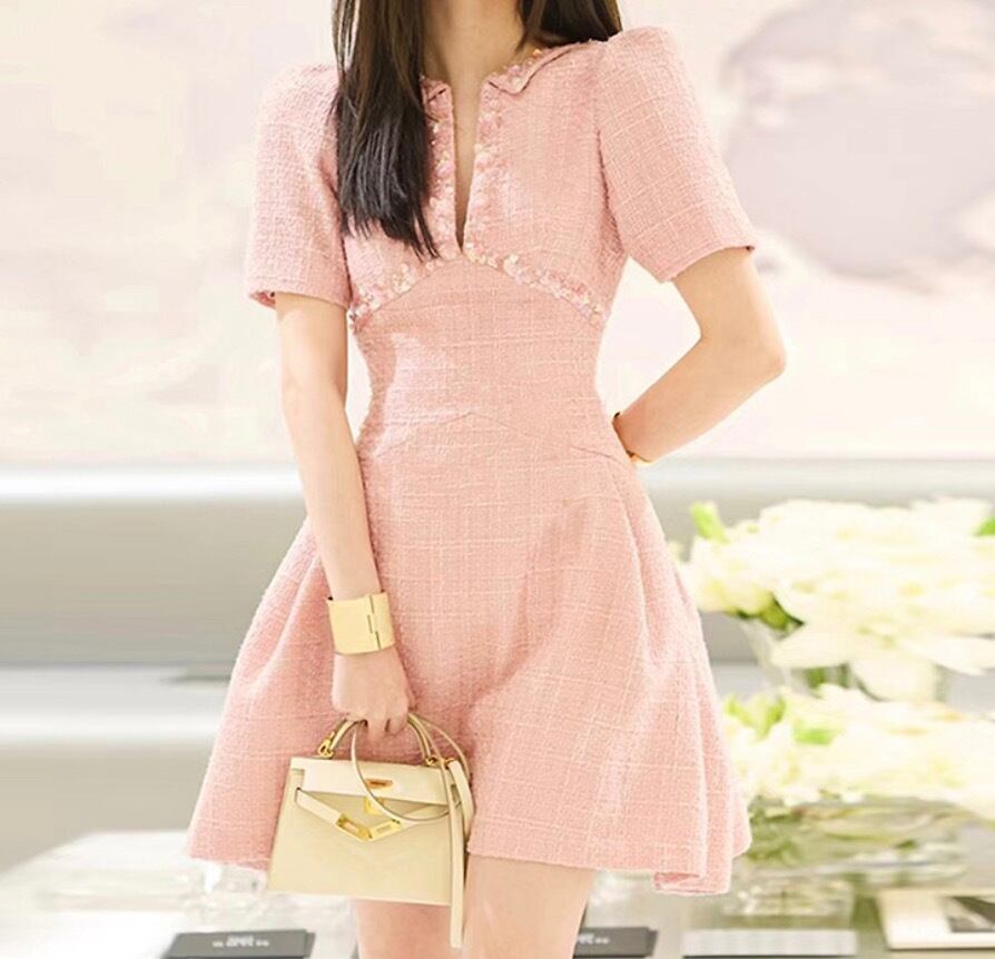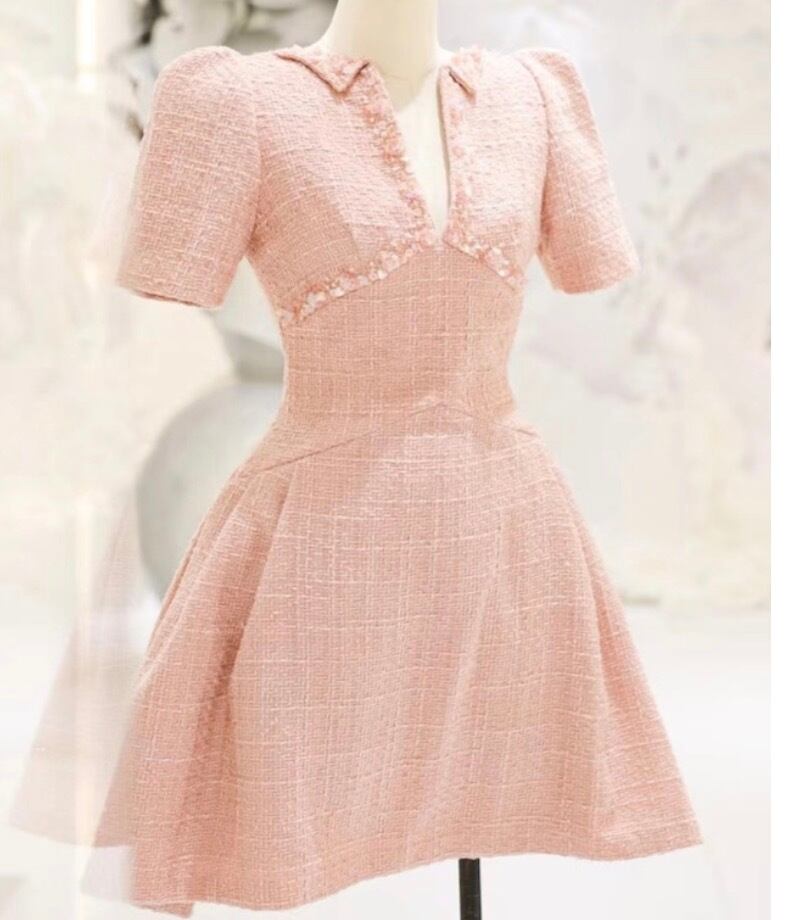 ツイード素材で仕立てられたエレガントなミニドレス。フレアシルエットが女性らしさを引き立て、さりげない華やかさを演出します。