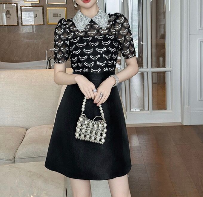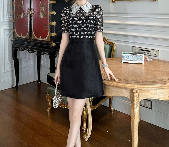 繊細なシアーレースとエレガントな襟がポイントのミニドレス。シンプルながらも華やかさを演出する一着で、フォーマルなシーンにもぴったりです。