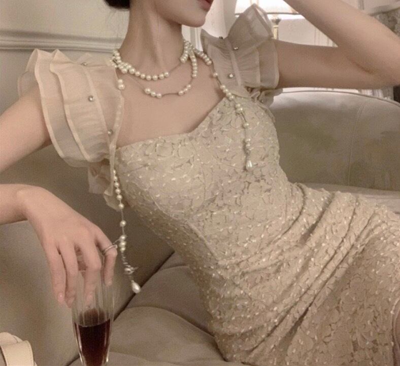 フリルスリーブレースボディコンドレス