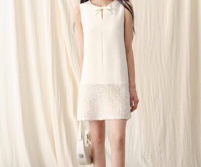 リボンディテールと裾のパール装飾が魅力のミニワンピース。シンプルでありながら、エレガントな雰囲気が特別なシーンを彩ります。