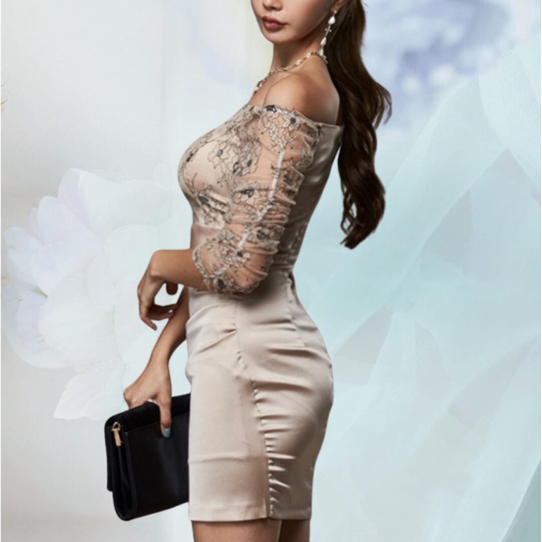 上品なサテン素材にレースディテールを施したオフショルダーワンピース。柔らかくフィットするシルエットと肩を美しく見せるデザインが、特別なシーンにぴったりです。優雅で華やかなスタイルを演出します。