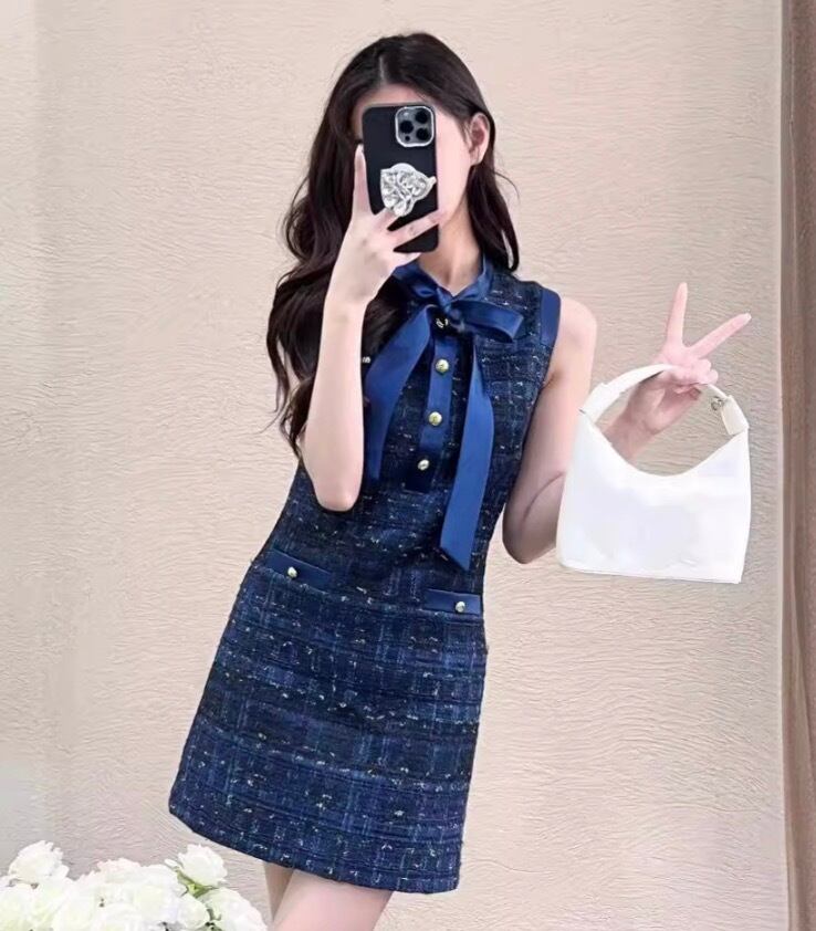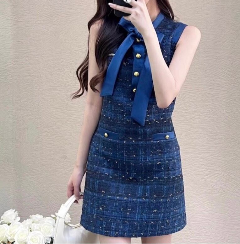 上品なツイード素材とリボンディテールが印象的なミニワンピースです。クラシックなデザインにゴールドボタンがアクセントを添え、フェミニンかつスタイリッシュな印象を演出します。カジュアルなシーンからフォーマルな場面まで幅広く活躍する一着です。