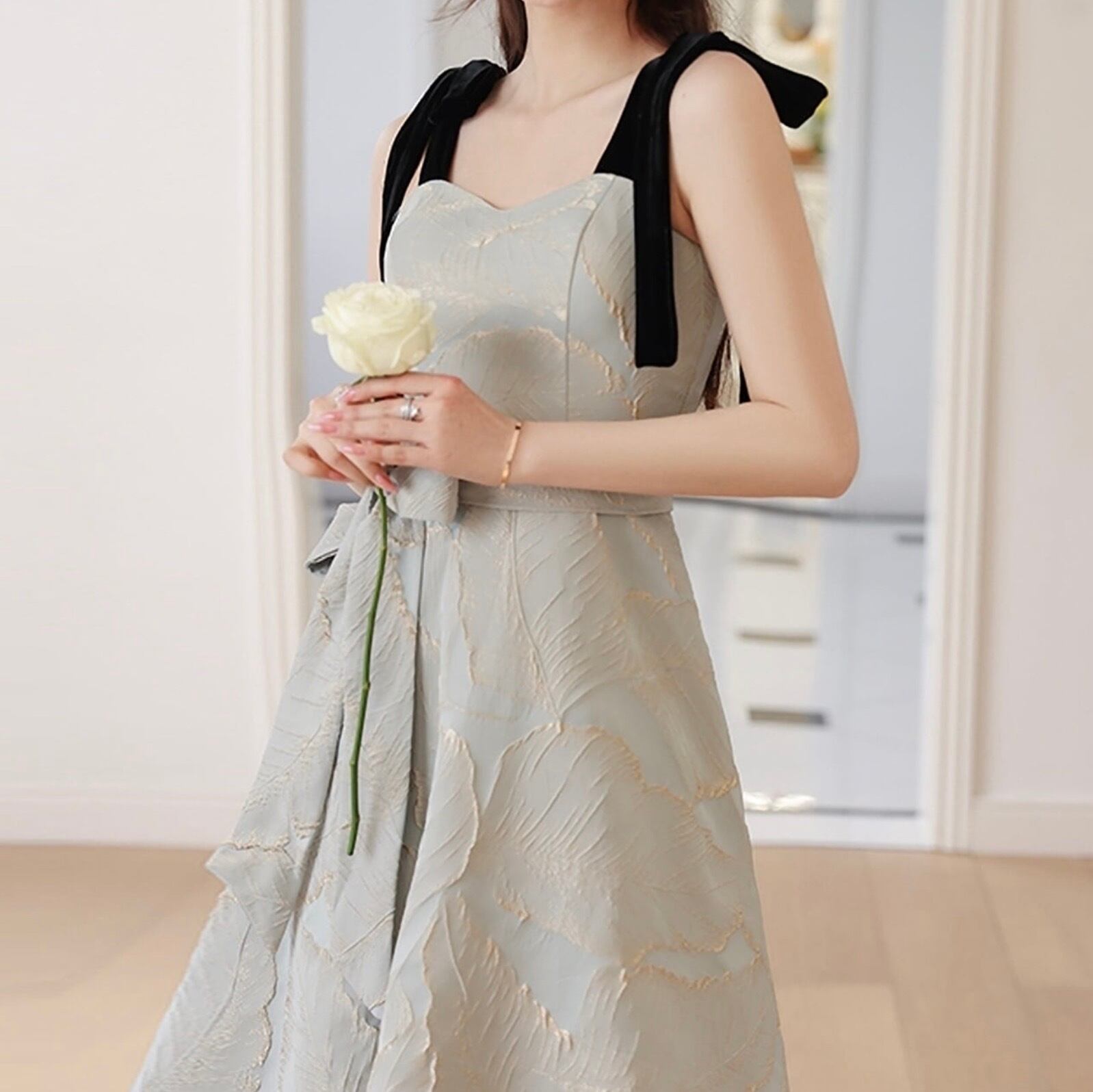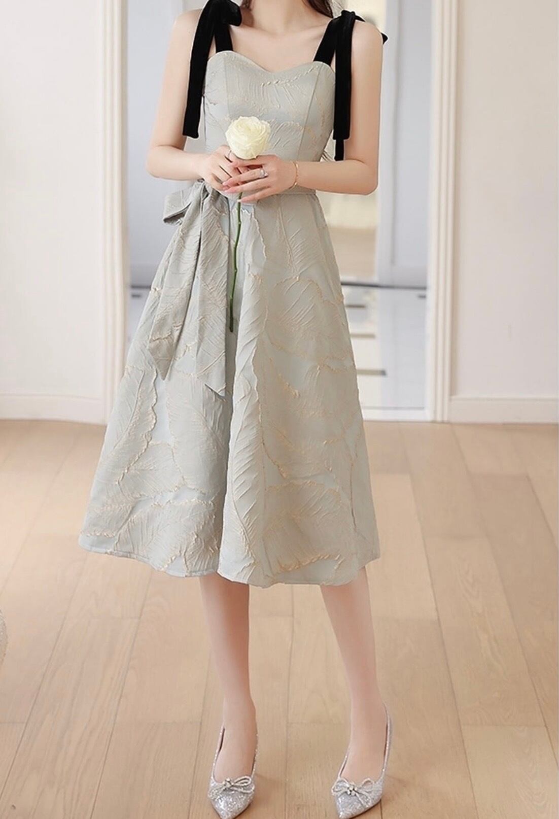 肩のベルベットリボンがエレガントなアクセントとなり、特別な日にぴったりの一着です。シンプルながら華やかさを