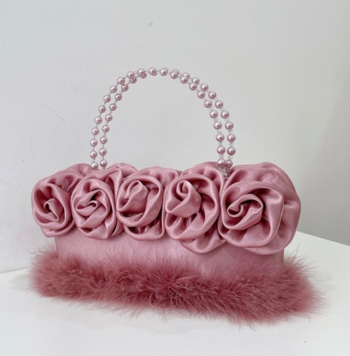 高級感あふれるローズデザインとフェザーディテールが魅力のハンドバッグ。ハンドル部分にはパールを使用し、エレガントな仕上がりに。パーティーや結婚式など特別なシーンで、華やかさをプラスするアイテムです。