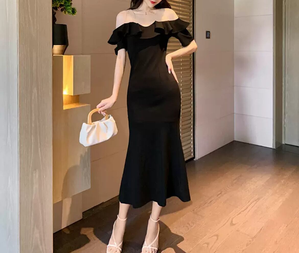 フェミニンを減らすオフショルダーとエレガントさを感じるフリルデザインが魅力のマーメイドドレス。特別さを演出します。夏のおしゃれにぴったりの一着です。